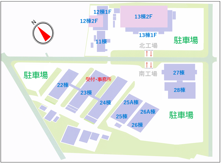 | 22棟 ・・・・・ 食堂/講堂 | 25A棟 ・・・ 横型成形機 | 27棟 ・・・ プレス工場 |